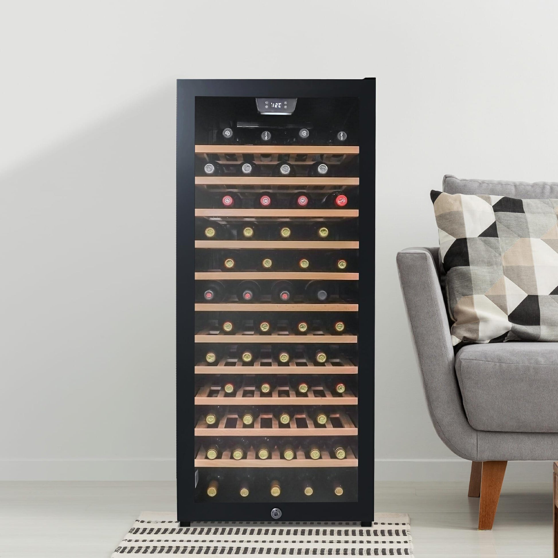 Designed for the wine aficionado this 8.4 cu. ft. cooler stores and preserves up to 94 bottles of your favorite vintages. This freestanding single-zoned wine cooler can be set between 41f and 64f which can be viewed and monitored from the outside through its glass door. Keep your wine collection perfectly chilled and beautifully displayed in this all black cooler with its natural beechwood shelving. This unit also features a reversible door which can be adjusted for left or right-hand opening and a lock to secure its contents! Rest easy with this coolers quiet operation and 12-month parts and labor coverage.