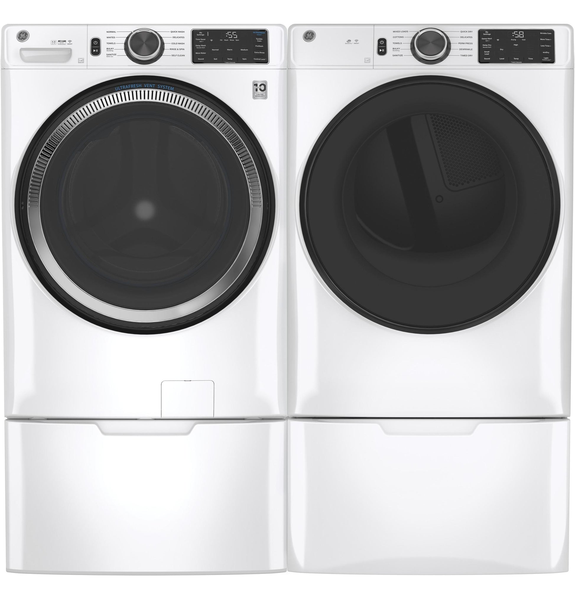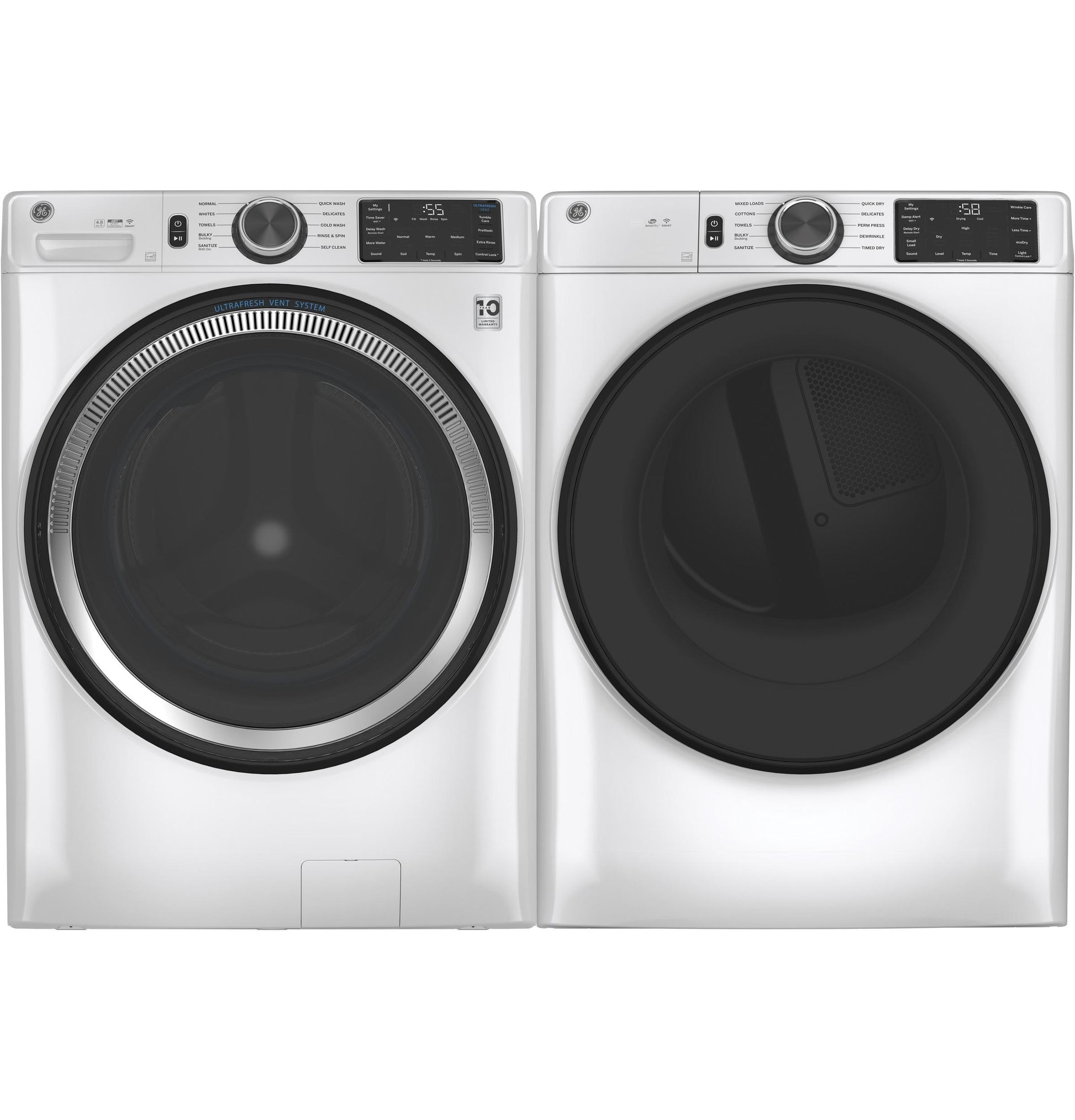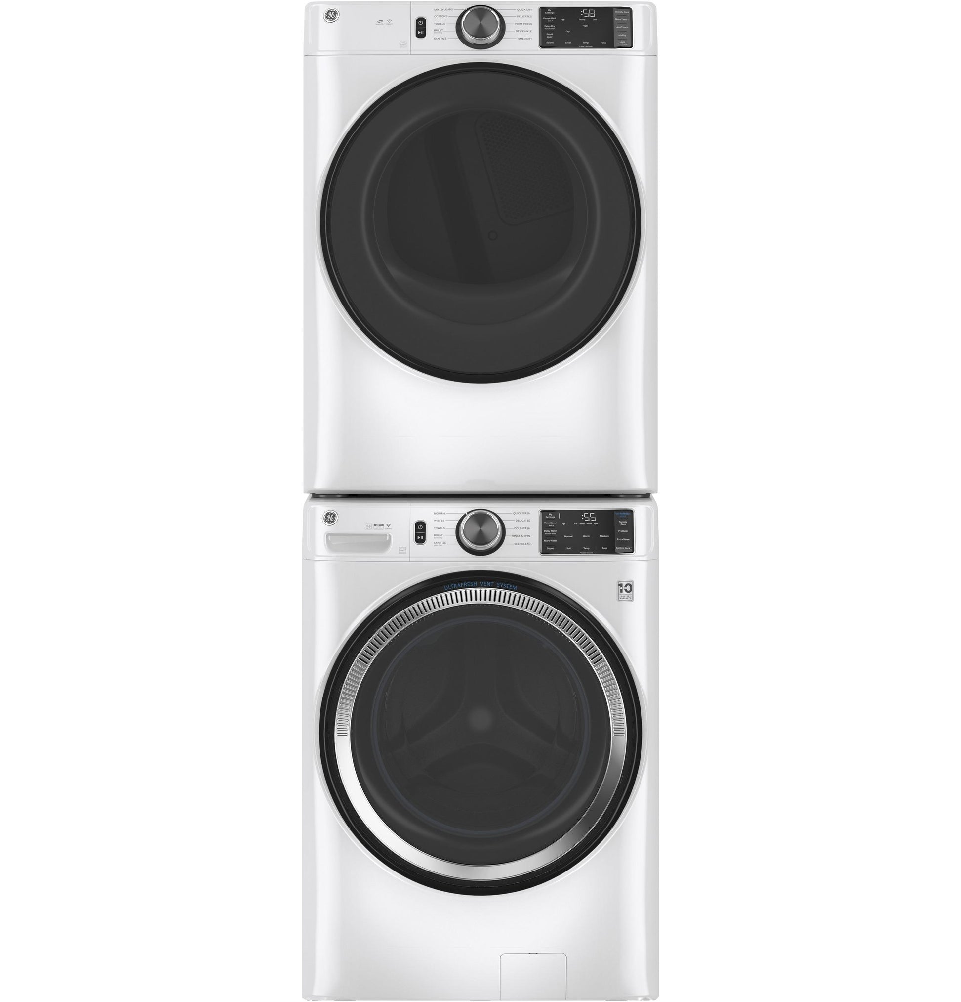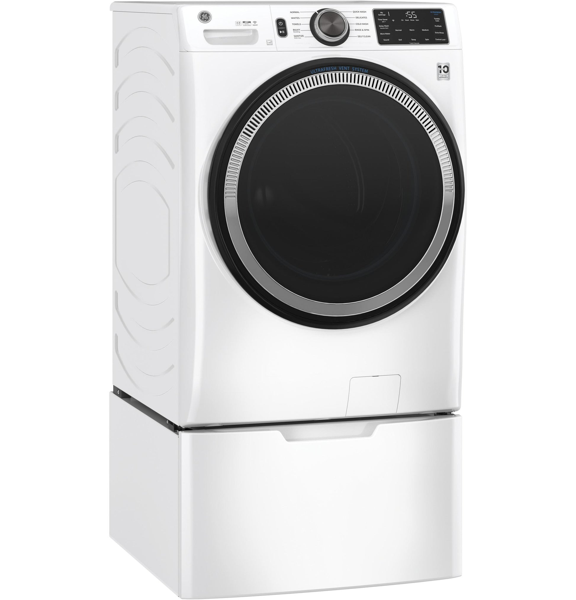 UltraFresh Vent System With OdorBlockThe first and only UltraFresh Vent System with OdorBlock eliminates excess moisture to help prevent odors ensuring your washer stays fresh and clean allowing you to leave the door closed between washes.Microban antimicrobial technologyBuilt-in protection that lasts. Microban Antimicrobial Technology is infused into key washer components like the gasket dispenser and drain system helping to prevent odor causing bacteria.WiFi powered by SmartHQStay in control from anywhere. Use the SmartHQ app to start stop and monitor your laundry while receiving real-time updates and notifications.Sanitize with OxiRemove 99% of bacteria with a dedicated cycle that uses an Oxi additive to boost your detergent s cleaning power while keeping fabrics looking and feeling their best.Dynamic Balancing Technology >Our patented technology senses and rebalances uneven loads reducing noise and vibration during the spin cycle providing a quiet wash.Reversible DoorEasily reverse your washer and dryer door for superior installation flexibility.32-In DepthFits into more homes with no additional installation space required.Quick Wash CycleProvides a fast 20 minute wash for lightly soiled items.ENERGY Star qualifiedMeets or exceeds federal guidelines for energy efficiency for year-round energy and money savings.DimensionsW 28 in.x H 39.75 in.x D 32 in.10-year Limited WarrantyRest assured knowing your washer is backed by a 10-year warranty.Tumble CarePeriodically tumble clean damp clothes for up to 8 hours keeping them fresh to dry.