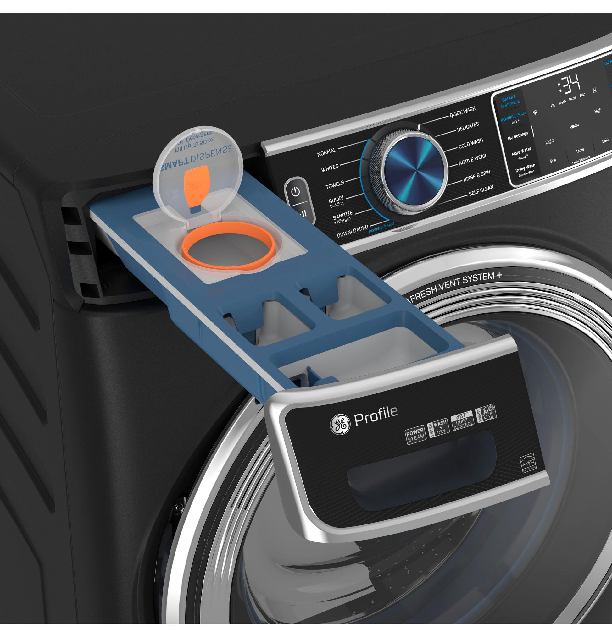 UltraFresh Vent System+ With OdorBlockThe first and only UltraFresh Vent System+ is enhanced with a sensor that detects and eliminates excess moisture to help prevent odors ensuring your washer stays fresh and clean.Microban Antimicrobial TechnologyGet protection that lives on load after load with antimicrobial technology built into components including the gasket dispenser and draining system.Adaptive SmartDispenseSave time and effort with a dispenser that holds enough detergent for up to 32 loads. Plus scan the barcode on the detergent bottle with the SmartHQ app and the washer will dispense the right amount based on the type of detergent.Smart Features Powered by SmartHQWith SmartHQ you can make sure your washer always has the latest features from extra cycles for jeans and swimwear to customized stain removal technology for treating up to 30 different stains. It also delivers remote status notifications and enables remote capabilities so you can easily control and monitor your washer from anywhere.1 Step Wash + DryWash and dry a small load in your washer eliminating the need to transfer clothes to the dryer.Adaptive MySettingsBy learning your preferences the washer and dryer personalize your cycle selections automatically.Sanitize + AllergenThis industry-first cycle sanitizes fabrics to kill 99% of common bacteria and allergens such as dust mites.Dynamic Balancing Technology >Our patented time saving technology senses and rebalances uneven loads during the spin cycle providing a quiet wash.Reversible DoorEasily reverse your washer and dryer door for superior installation flexibility.PowerSteamSteam safely penetrates deep into fabric fibers loosening stains and delivering enhanced cleaning performance.ENERGY Star QualifiedMeets or exceeds federal guidelines for energy efficiency for year-round energy and money savings.